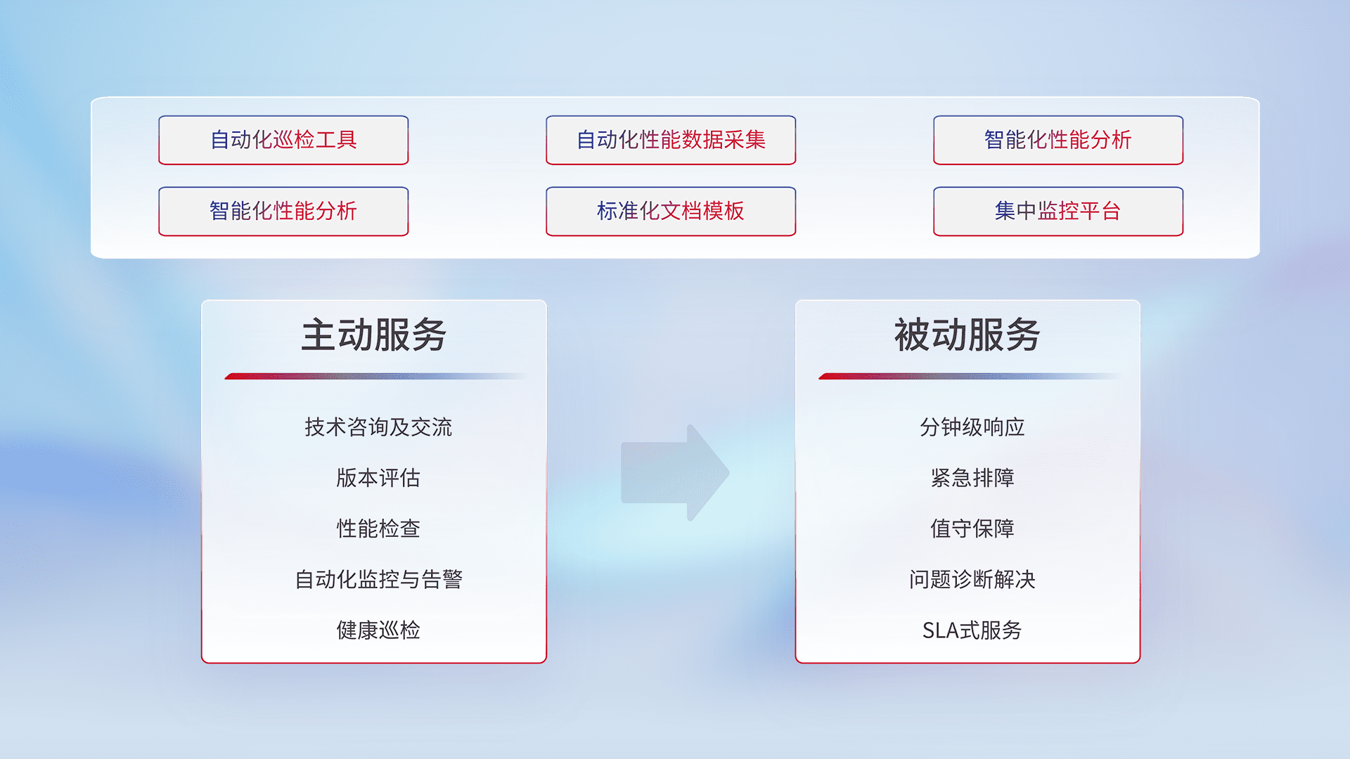 智能化工具和标准化文档,,,保障服务质量,,,,提供主动服务(包含技术咨询、、版本评估、、性能检查、、、自动化监控与告警、、健康巡检)和被动服务包含(分钟级响应、、、紧急排障、、、值守保障、、、、问题诊断解决、、SLA服务)。。。。