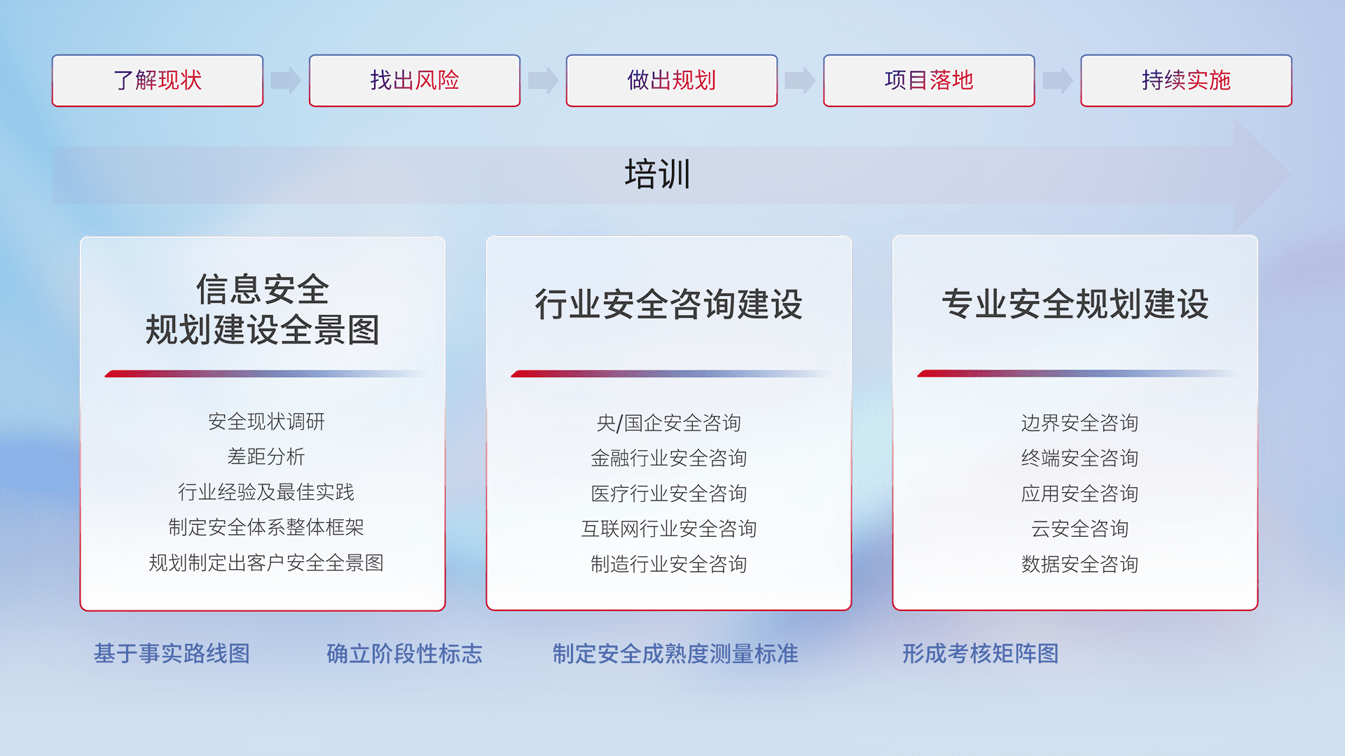 针对客户行业特性,,以专业的安全服务+多厂商联合解决方案提供专属的一站式安全管理服务,,,帮助客户全面感知网络空间威胁,,,基于识别、、、检测、、、、分析、、、防护、、、、监测、、响应的服务理论模型,,,从方案咨询、、、集成交付、、评估验证、、优化加固、、、、运维运营,,,致力于为客户提供完整的闭环管理式安全服务。。以实战经验为客户打造高抵御风险的安全体系,,,帮助客户发现威胁、、、对抗威胁、、、、处置威胁,,,,不断积累安全对抗能力,,,持续保障数字化安全。。。。
